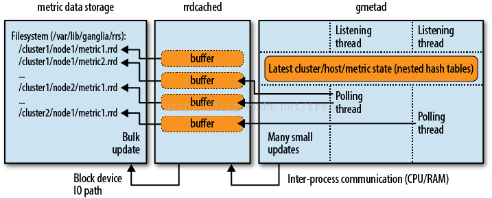 gmetad默认将指标数据直接写入文件系统上的RRD文件,在有I/O限制的大型装置中,rrdcached充当gmetad和RRD文件之间的缓存,如下图
