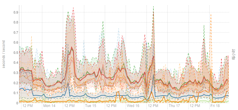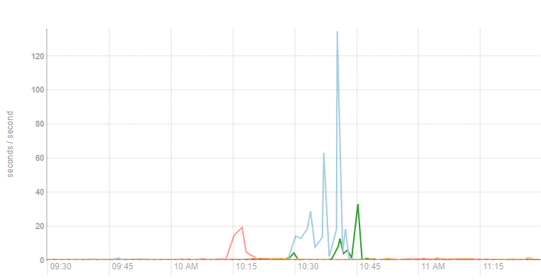 先观察了下集群系统资源的使用情况,发现网络、磁盘、内存等都没有什么迹象,唯独 CPU 负载就是居高不下,系统响应很慢,几乎不响应。几次使用 JVM 命令都无功而返。经过多次使用 Top 命令,才发现导致 CPU 负载过高(飙到200多)是 %sy 这项,表面现象是操作系统内核导致。之前无数次怀疑 Java 程序问题,GC 问题,看来方向错了,既然耗那么长时间才找到一丝线索,应该好好利用。下图是 %sy 监控情况: