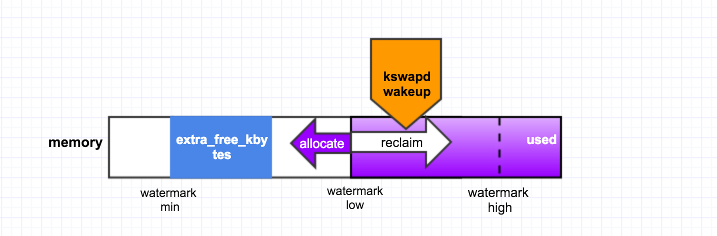 为了避免 direct reclaim,我们得保证在进程申请内存时有足够可用的 free pages,从前面我们可以看出,提高 watermark low 可以尽早的唤醒 kswapd,然后 kswapd 来做 background reclaim。为此,内核专门提供了一个 sysctl 接口给用户来使用:vm.extra_free_kbytes。