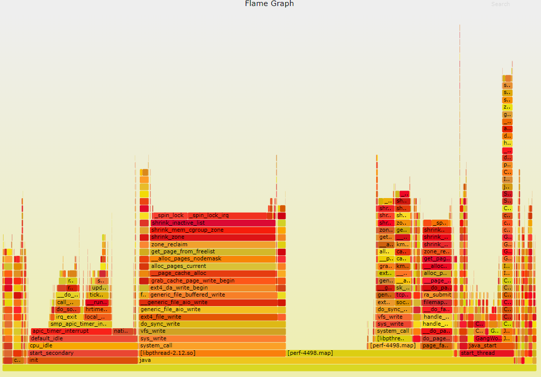 从火焰图我们也可以看到,申请内存的线程在等待自旋锁,操作系统现在正回收 pagecache 到 freelist。于是 zone 里来申请内存的线程都得在这里等待着,于是 load 值就高了上来。外在的表现就是,系统反应好慢啊,ssh 都登不进去(因为 ssh 也会申请内存);即使登录进去了,敲命令也没有反应(因为这些命令也都是需要申请内存的)。
