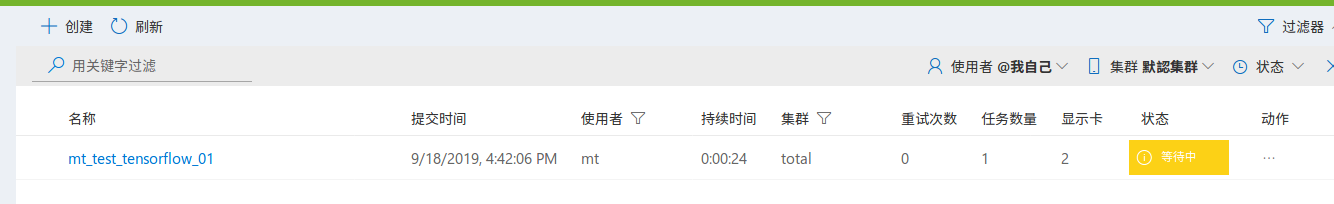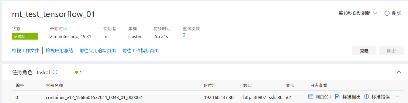 作业名称自己随意写,不能和之前的重复,镜像地址在前面第四章中提到过 ( 192.168.137.10:8888/27_test/tensorflow-gpu:latest )