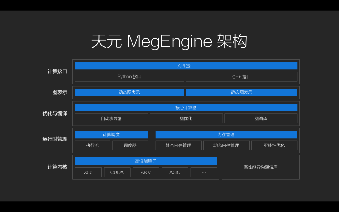 从上到下,天元可以分为五个层次,最上面是计算接口层,向外连接了 Python 和 C++ 接口,开发者可以通过 Python 和 C++ 两种语言对整个框架进行使用和编程,以及系统的设计和研发、训练和推理。