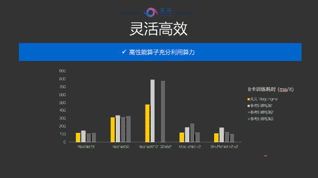 在框架设计时,天元秉持要灵活高效的原则,在许多的设备、算法上,都能得到领先的性能。接下来,田忠博放出了训练性能对比图,与若干擅长推理的框架进行横向对比。