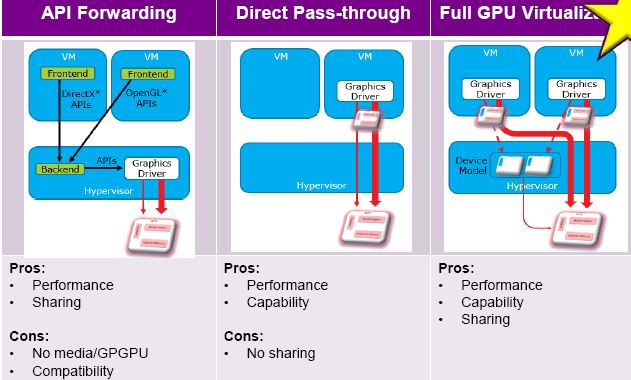 第三个最先进,它支持 GPU 全虚拟化,以及在多个虚机之间共享一个物理GPU。目前已经在 Xen 中完整地支持该技术(XenGT 项目)。但是在 KVM 中,KVMGT 是在 KVM 内的实现,但是直到 2014/12月 Intel 才出一个 KVMGT 版本,目前仍然处于初级阶段(资料来源)。