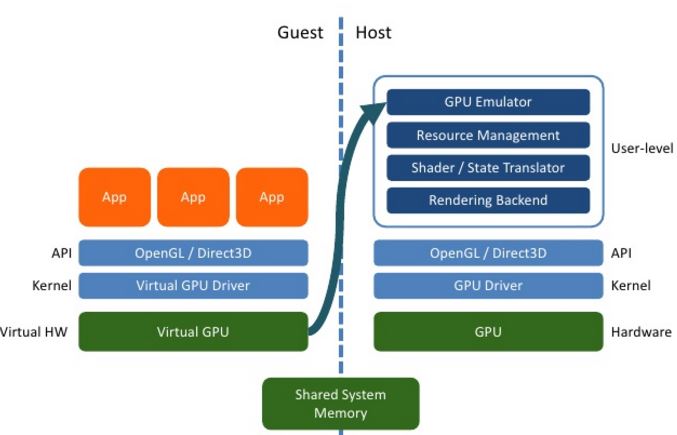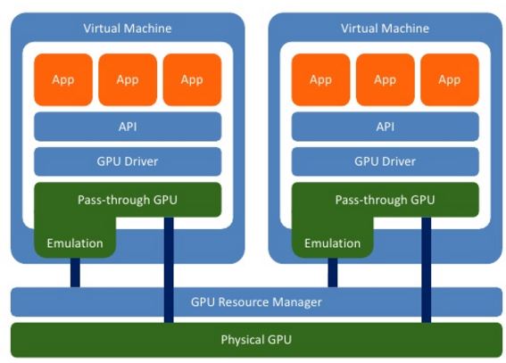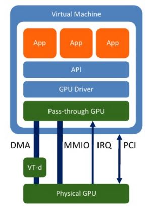 在客户机中提供一个仿真虚拟GPU,客户机上应用对它的调用都会被仿真层转化为对Hypervisor上物理 GPU 的调用。