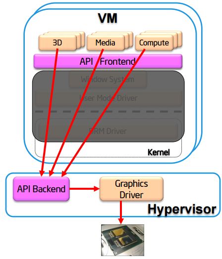 全虚拟化方案中,每个虚机拥有一个虚拟的GPU实例,多个虚机共享一个物理 GPU。下图是 Intel 的 GPU 全虚拟化示意图:
