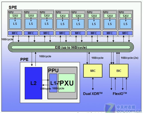 在此结构中,一个 PPC 处理器作为监管处理器,与大量的 SPE流处理器相连通,组成了一个工作流水线。