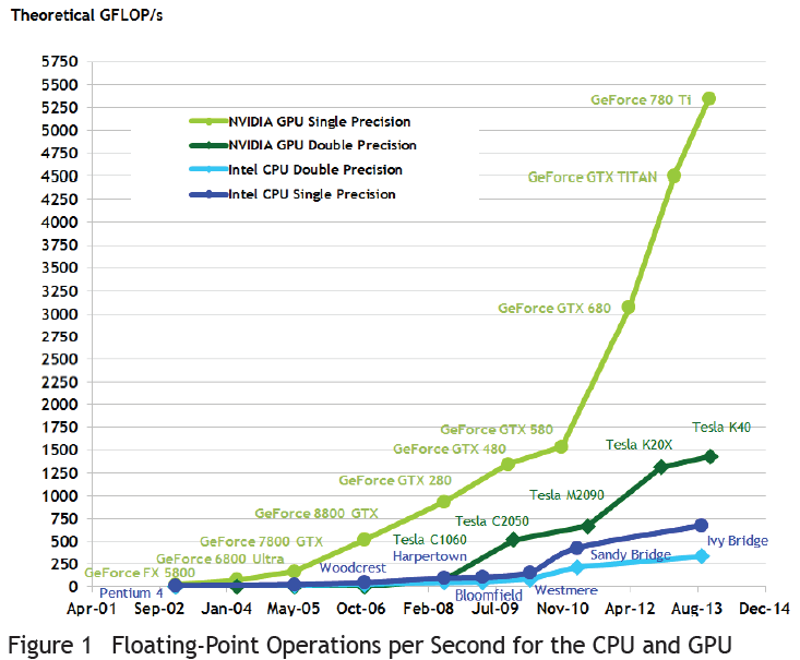 GPU 特别适合用于并行计算浮点类型的情况,下图展示了这种情况下 GPU 和 CPU 计算能力的差别: