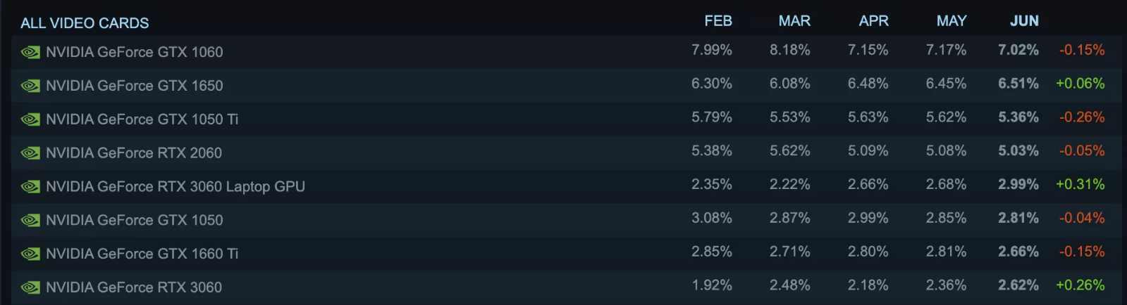 在 Steam 最新一期 2022 年 6 月硬件报告中显示,GTX 1060 依旧是这个月活用户达 1.32 亿的平台使用人数最多的显卡,占平台用户 7.02%。