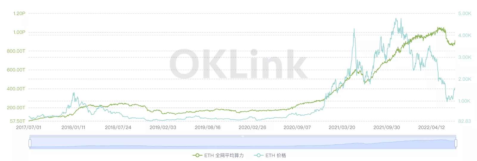 ETH 全网算力与价格(2017.07-2022.07),图源:OKLink