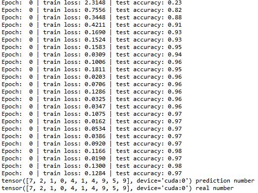 pred_y = torch.max(test_output, 1)[1].cuda().data # move the computation in GPU