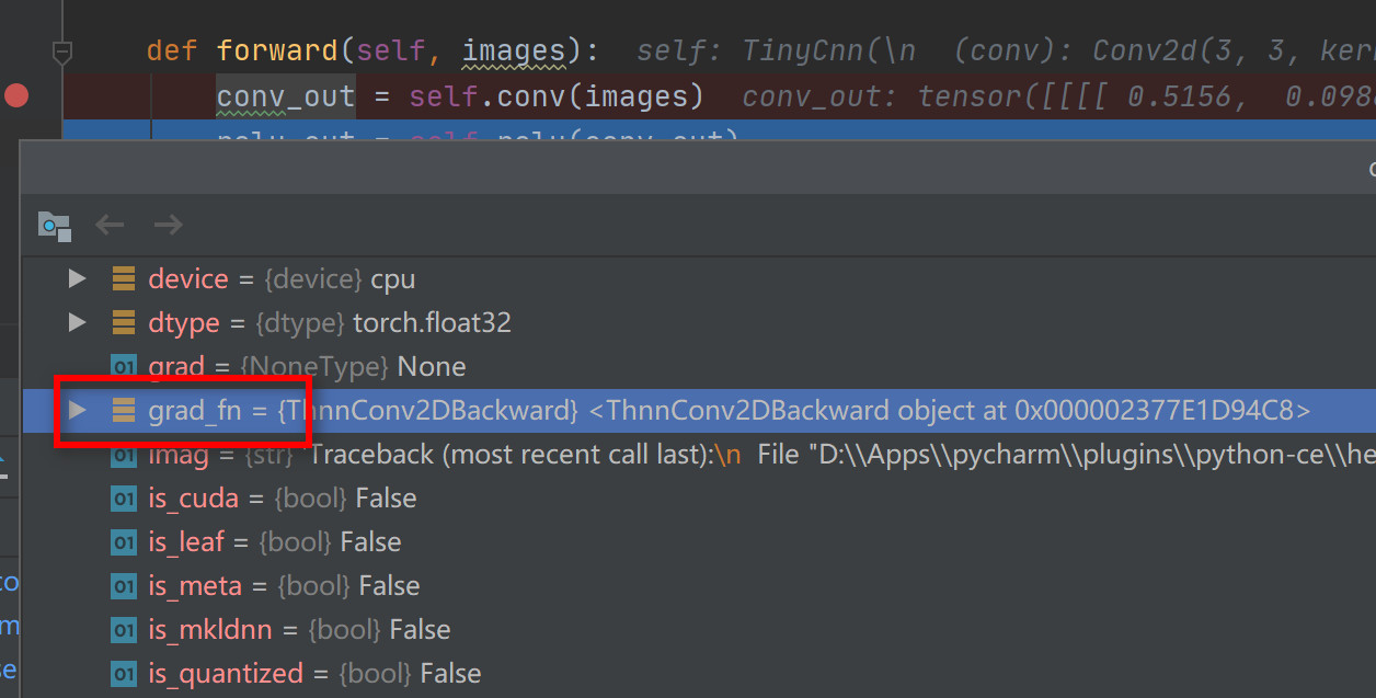 上面的动态图详解了pytorch如何构建前向传播的动态神经网络的,实际上pytorch并没有显式的去构建一个所谓的动态图,本质就是按照forward的代码执行流程走了一遍而已。那么对于反向传播,因为我们没有构建反向传播的代码,pytorch也就无法像前向传播那样,通过我们手动编写的代码执行流进行反向传播。那么pytorch是如何实现精确的反向传播的呢?其实最大的奥秘就藏在tensor的grad_fn属性里面。有的同学可能在调试pytorch代码的时候已经不经意的遇到过这个grad_fn属性。如下图所示: