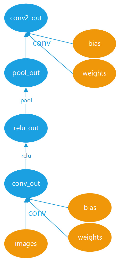 node其实是一个链表,有一个next_edges_属性,里面存储着指向下一级的所有node。注意它不是一个简单的单向链表,因为很多tensor可能是由多个tensor创建来的。例如tensor a = tensor b + tensor c. 那么tensor a的grad_fn属性里面的next_edges就会有两个指针,分别指向tensor b和tensor c的grad_fn属性。在python层,next_edges_属性被封装成了next_functions。因此正确的说法是:tensor a的grad_fn属性里面的next_ functions,指向了tensor b和tensor c的grad_fn属性。其实有了这个完整的链表,就已经完整的表达了反向传播的计算图。就可以完成完整的反向传播了。 下面我们通过一个小例子来进一步说明grad_fn是如何表达反向传播计算图的。首先我们定义一个非常简单的网络:仅有两个conv层,一个relu层,一个pool层,如下图所示(conv层带有参数weights和bias):