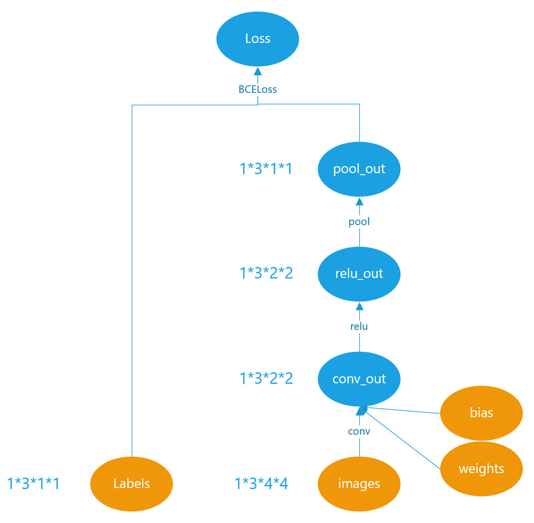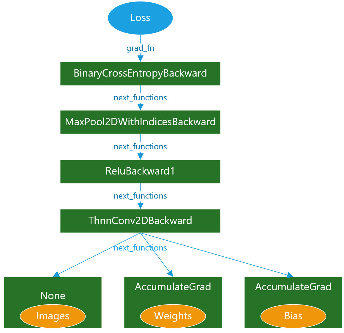 可以看到loss的grad_fn为:<BinaryCrossEntropyBackward object at 0x000001A07E079FC8>,而它的next_functions为:(<MaxPool2DWithIndicesBackward object at 0x000001A07E08BC88>, 0),继续跟踪MaxPool2DWithIndicesBackward的nex_functions为:(<ReluBackward1 object at 0x000001A07E079B88>, 0),如果继续跟踪下去,整个反向传播的计算图就非常的直观了,使用下图表示: