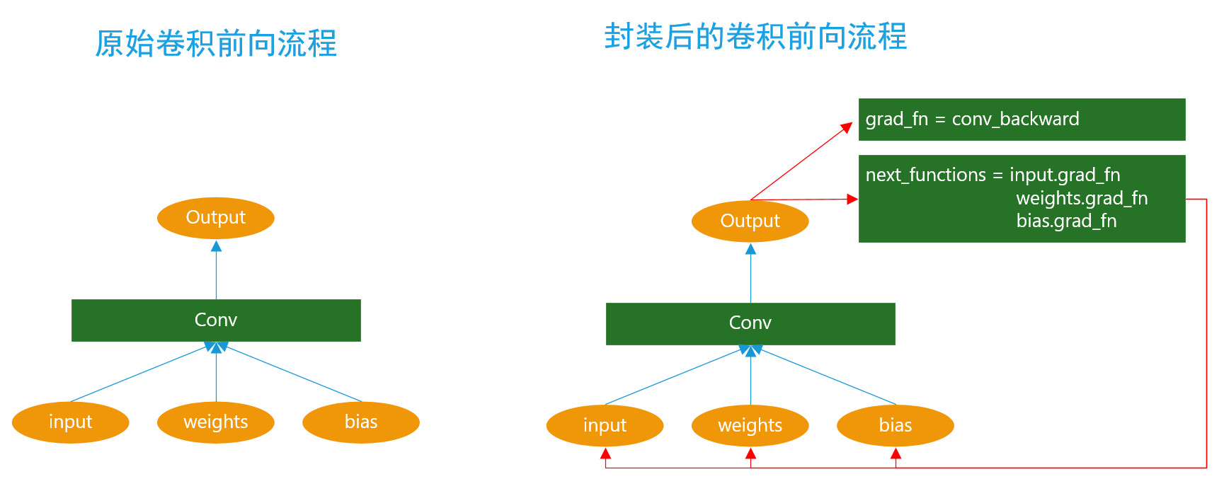 有了上面的介绍,其实大家应该已经大致了解了pytorch自动微分的大致流程。实际上是通过tensor的gran_fn来组织的,grad_fn本质上是一个链表,指向下一级别的tensor的grad_fn,因此通过这样一个链表构成了一个完整的反向计算的动态图。那么最后有一个问题就是tensor的grad_fn是如何构建的?无论是我们自己编写的上层代码,还是在pytorch底层的op实现里面,并没有显示的去创建grad_fn,那么它是在何时,又是如何组装的?实际上通过编译pytorch源码就能发现端倪。Pytorch会对所有底层算子进一个二次封装,在做完正常的op前向之后,增加了grad_fn的设置,next_functions的设置等流程。如下图所示为原始卷积的前向流程和经过pytroch自动封装的卷积前向计算流程对比。可以明显的看到多了一些对grad_fn设置的代码。
