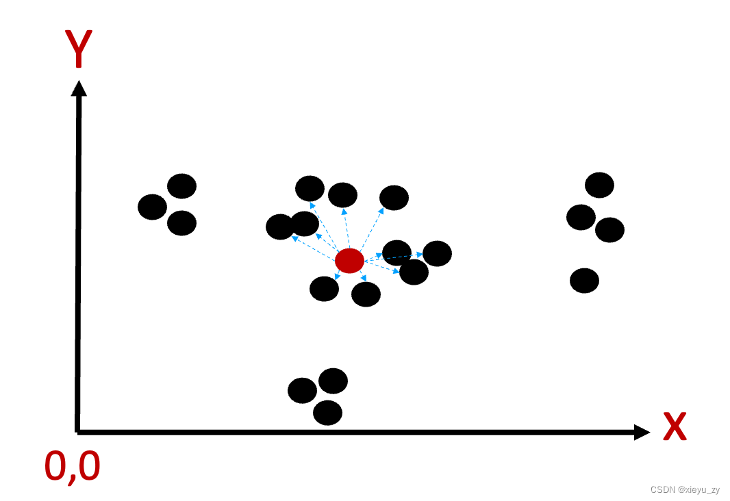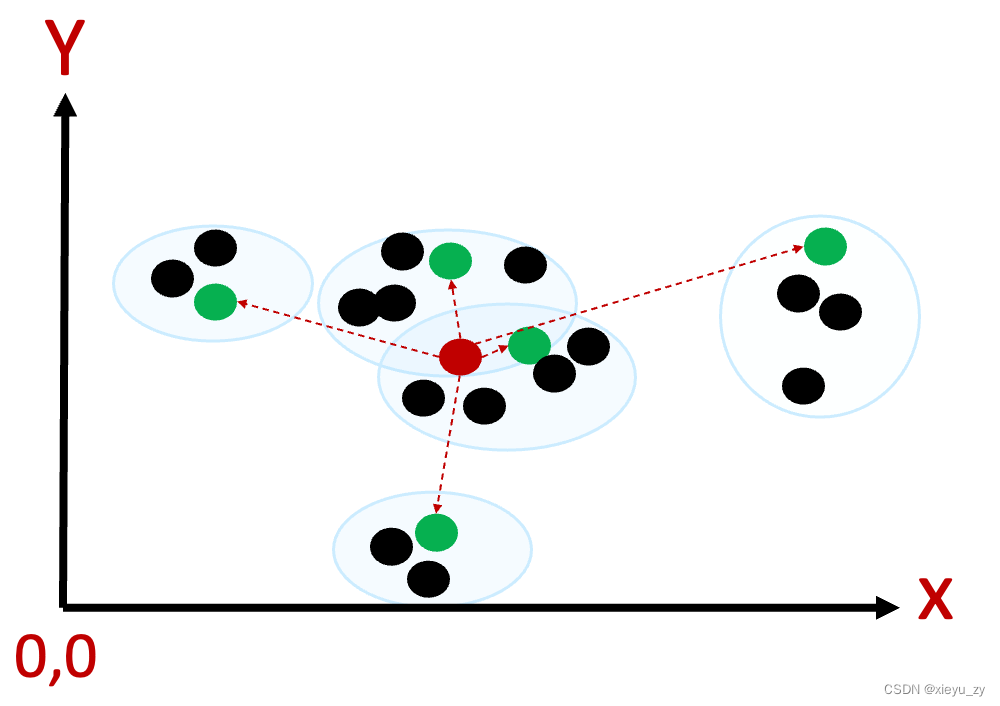 从上图可以看出数据有“成堆”出现的现象,假设有一种办法可以将他们提前将顺序挨着的多个点组成小组,每个小组有个小组长(或者叫中心点),小明的成绩首先和每个小组长算距离,如果距离太长这个小组就直接淘汰,如果距离近就在小组内与小明判别成绩差,如下图所示: