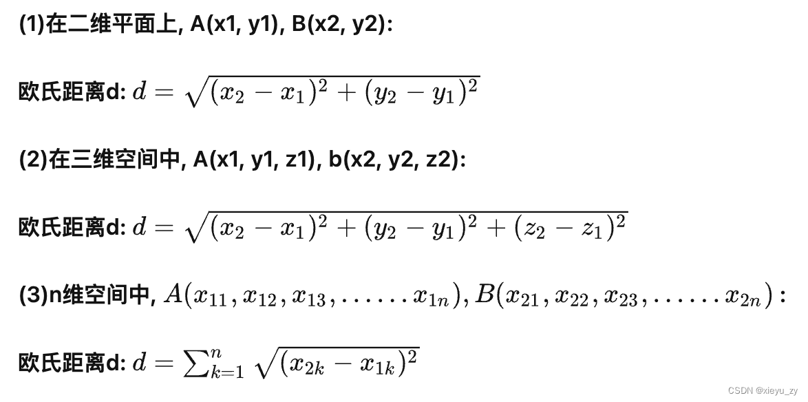 关于“距离”,在二维平面上计算2个点距离,中学数学有一个公式:“欧氏距离”,当然欧氏距离同样可以用于计算三维、四维空间点与点之间的距离,在AI领域简单叫:L2距离,当然除此之外,还有:L1(Hanming距离)、IP(内积)、Jaccard等算法,可参考文档:Introduction - Milvus vector database documentation