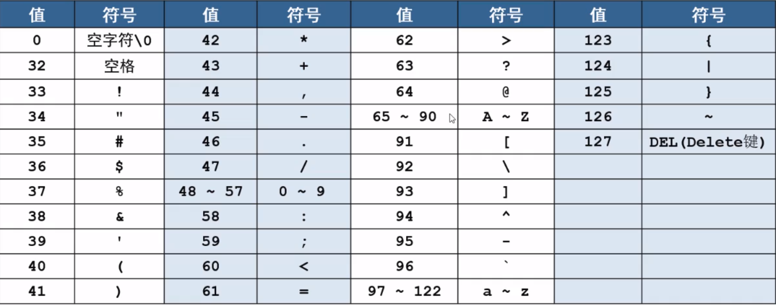 | 字符型 | char | 8 | -128~+127 |