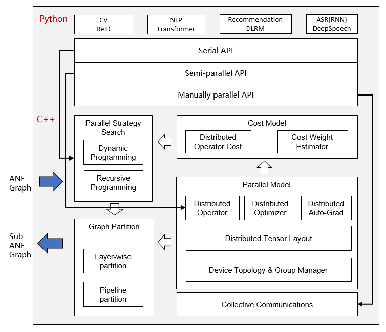 目前MindSpore采用的是算子切分的细粒度并行策略,即图中的每个算子被切分为一个集群,完成并行操作。在此期间的切分策略可能非常复杂,但是作为一名Python开发者,您无需关注底层实现,只要顶层API计算是有效的即可。