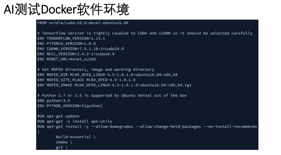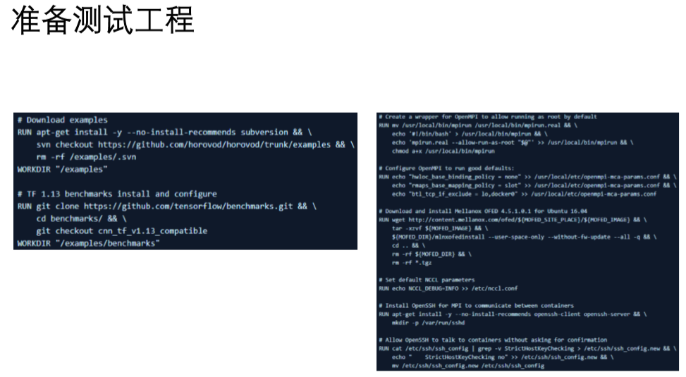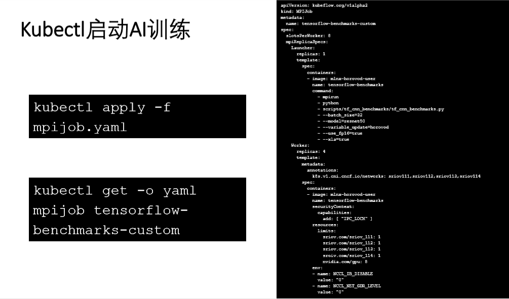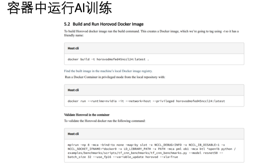 分布式TensorFlow 神经网络训练基准测试参考 驱动、内核软件、训练框架和集群通信软件准备 网络、服务器和容器平台配置 通过NCCL和Horovod集群通信框架,分布式运行集群训练任务 https://docs.mellanox.com/pages/releaseview.action?pageId=15049828 https://docs.mellanox.com/pages/releaseview.action?pageId=15049840