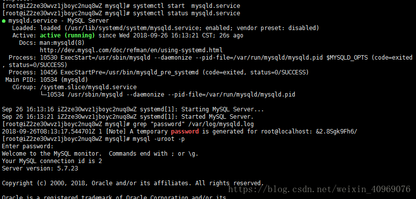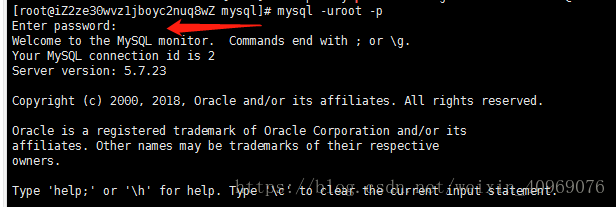 [root@iZ2ze30wvz1jboyc2nuq8wZ mysql]# mysql -uroot -p 这里到-p就行了,回车会提示你输入密码的