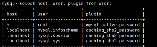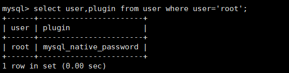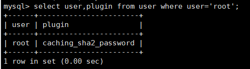 通过命令 select user,plugin from user where user='root'; 我们可以发现加密方式是caching_sha2_password