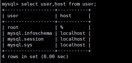 mysql> select user,host from user;