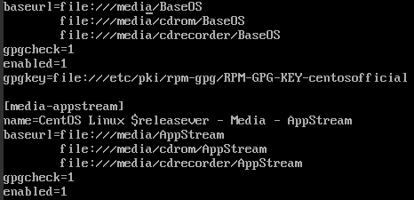 enable=0改为enable=1(开启网络源),将baseurl=file://media/CentOS/BaseOS的CentOS删除,仅保留挂载路径media即可,也可以是mnt