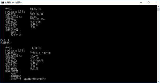 如果你用的不是Administrator账号,你是看不到系统盘加密进度的。这种情况下,你可以利用管理员命令提示符或是PowerShell执行manage-bde -status命令来查看加密进度。