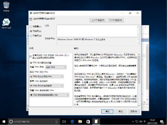 将其配置成“已启用”,并开启“没有兼容的TPM时允许BitLocker”。