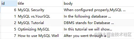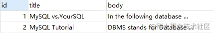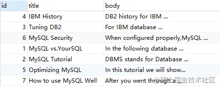 MATCH ( title, body ) AGAINST ( 'MySQL' );