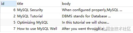 上述语句,查询包含确切短语 'MySQL Security' 的行信息。