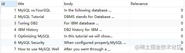 MATCH ( title, body ) against ( 'MySQL' ) AS Relevance