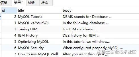 上述语句,查询的 'MySQL IBM' 没有 '+','-'的标识,代表 word 是可选的,如果出现,其相关性会更高