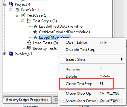一、在“Project 4”中随便找一个“GroovyTestStep”,本例以“LoopIfMoreRows”未操作对象,右击该TestStep在菜单中点击“Clone TestStep”