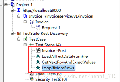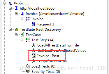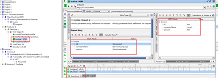 基于之前的实例,invoiceCSV的值可以用在web服务的请求中。为此,需要将invoice值放在可以从后续REST测试请求TestStep或(SOAP)测试请求TestStep访问它们的地方。参考”1.7使用REST discovery(pro)生成SoapUI测试”创建post请求测试,在此不做赘述: