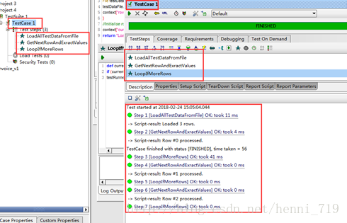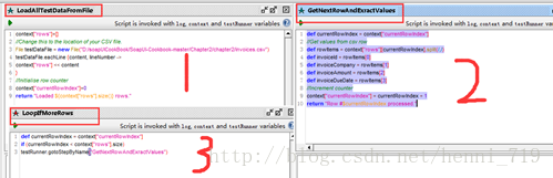 我将操作分解成三个独立的GroovyTestStep:一个用于读取测试数、一个用于提取数据、一个用于循环所有行。执行步骤如下: