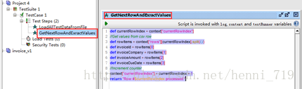 该项目中名为GetNextRowAndExractValues的Groovy TestStep从context中获取当前行并用逗号分隔行字符串以获取字段值数组。最后,currentRowIndex会递增,并返回经过处理的文本行#$currentRowIndex,以在TestCase窗口中提供一些调试输出。它位于GetNextRowAndExractValues Groovy TestStep内部,可以使用invoiceCSV值(提取到变量invoiceId,invoiceCompany,invoiceAmount和invoiceDueDate)来测试某些内容,或者将它们传递给另一个TestStep,例如,使用它们填充Web服务请求(请参阅下面的例子)。