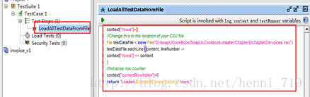 第一步利用GroovyFile类读入invoices.csv文件。Groovy File类比标准的Java类更方便使用,它对于通过Groovy实现自动化非常重要。eachLine方法允许我们把CSV文件中每行内容添加到一个rows集合中,该集合存储在SoapUI的上下文中。