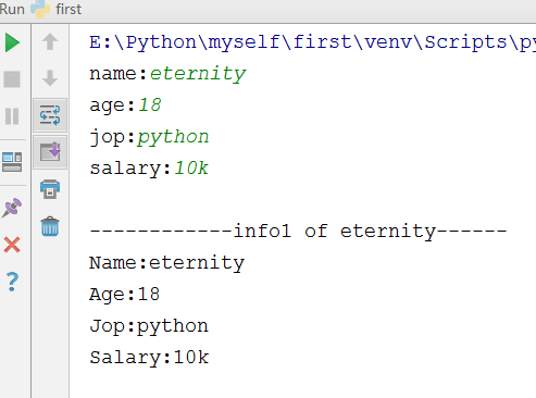 1 info3 = """ 2 -----------info3 of {name2}------- 3 Name:{name2} 4 Age:{age2} 5 Jop:{jop2} 6 Salary:{salary2} 7 """.format(name2=name,age2=age,jop2=jop,salary2=salary) #可理解为一个数组 8 print(info3)