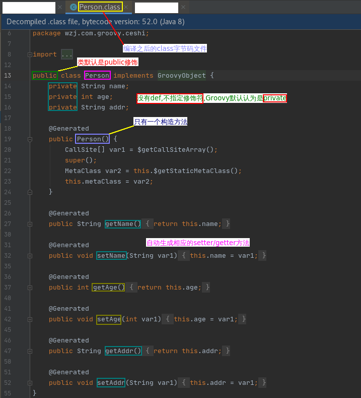2、没有'可见性修饰符'的'字段'修饰符默认是'private',同时会'自动生成'对应的setter和getter方法