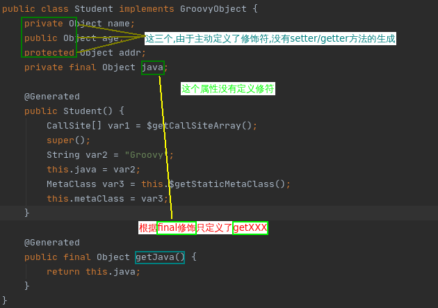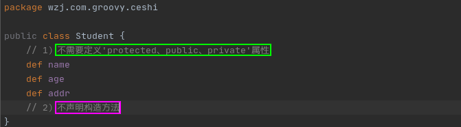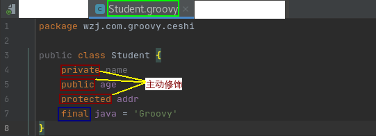 Groovy语言还有一个规则: 如果你'主动声明'一个属性为" private "、" public "或" protected ",那么你只是'声明了一个属性',这意味着你'要自己写'属性的" set "和" get "方法