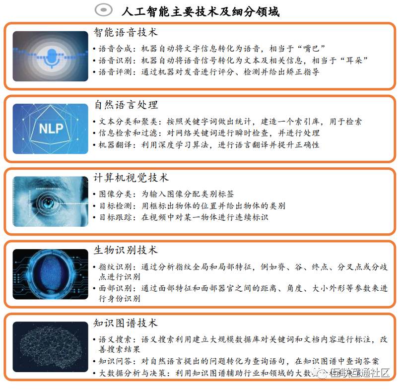 计算机视觉技术:主要指图像分类、目标检测、目标跟踪等技术,成熟应用包括人脸识别、视频结构化、姿态识别技术等。