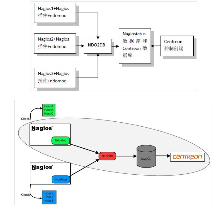 简单通俗点儿讲,就是nagios和nagios plugin利用NDOMOD模块进行监控并采集数据,NDOUtils将监控得到的数据通过NDO2DB守护进程写到数据库,Centreon获得数据库中的信息并将信息先是到web界面。