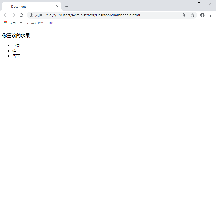 <!DOCTYPE html> <html lang="en"> <head> <meta charset="UTF-8"> <title>Document</title> </head> <body> <h3> 你喜欢的水果</h3> <ul> <li>苹果</li> <li>橘子</li> <li>香蕉</li> </ul> </body> </html>