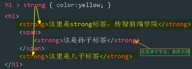 子元素选择器是让css选择器只能选择儿子辈的元素,例如:h1>strong { color : red; }