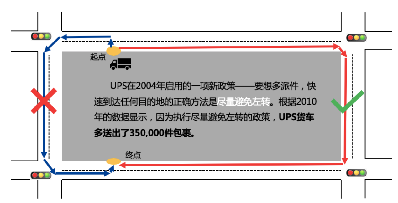 USP快递(美国快递公司)在地图上叠加红绿灯信息、物流网点信息以及实时车流等信息,再在图上对以往的货车轨迹进行分析,发现等待红绿灯的时间过长是影响派件效率的重要因素,于是2004年启用新政策——尽量避免左转。执行6年后,2010年的数据显示,1年多送出了350000件包裹。