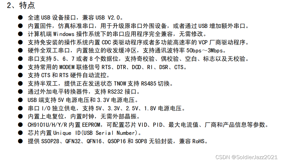 因为咱也不是专门研究这类芯片的,专业的事儿交给专业的人处理,直接发邮件给官方咨询关于芯片选型的问题,主要目的是替代FT232芯片,功能参数方面可以满足我们项目需求即可。意想不到的是,上面表格中的CH9101芯片和FT232RL、FT232RQ、FT230XS、FT230XQ系列的是PinToPin引脚兼容的型号。先去官网看了下芯片手册(说实话,因为懒,很多FT芯片特性的英文资料也没有好好理解,这次有了中文资料和国内技术支持就可以好好研究一番了)。这次主要研究下一些新的特性,直接上图: