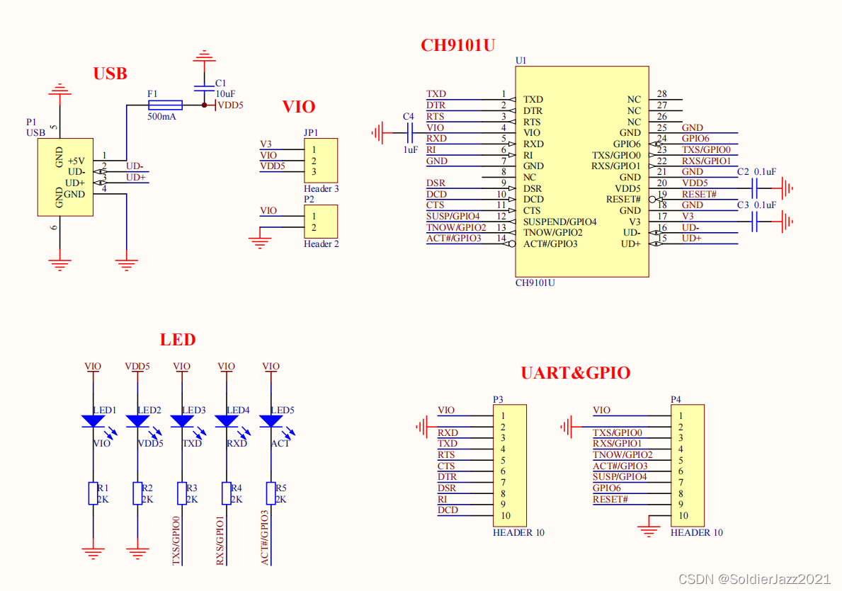 官方参考设计上,还特别预留了选择VIO供电电压的插针,在使用3.3V串口的时候,VIO直接连接V3引脚就可以了,不用再单独用3.3V电压转换芯片了。