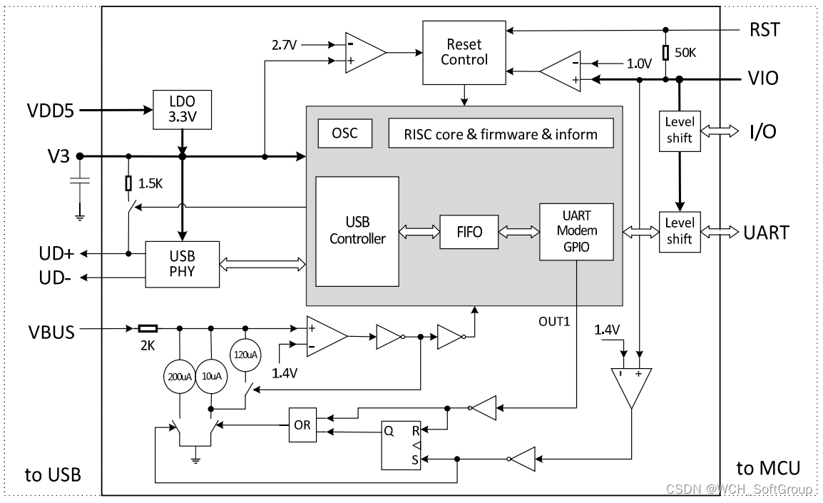 VDD5支持5V或3.3V电源电压,当VDD5引脚输入5V工作电压(实际上大于3.8V)时,内部LDO工作,V3引脚会输出3.3V电源供芯片内部USB收发器使用。当VDD5引脚输入3.3V工作电压(实际上小于3.6V)时,V3引脚需要和VDD5连接,同时输入外部的3.3V工作电压。